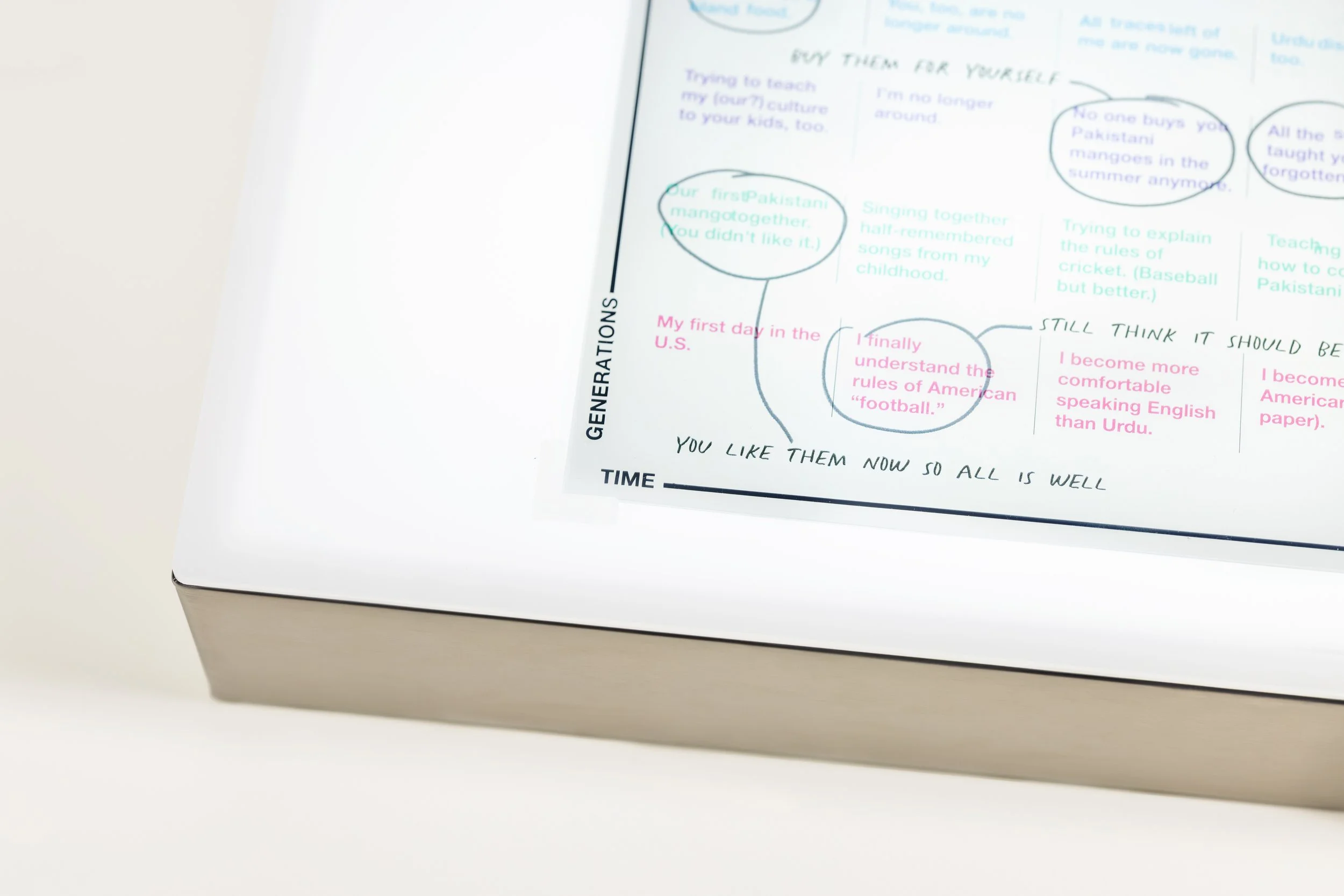 Each transparency shows a partial diagram. On its own, it doesn’t fully make sense. When the panels are stacked together, they form a single chart. One axis tracks time. The other tracks generational change. The combined image maps how a family slowly becomes “American” over multiple generations.