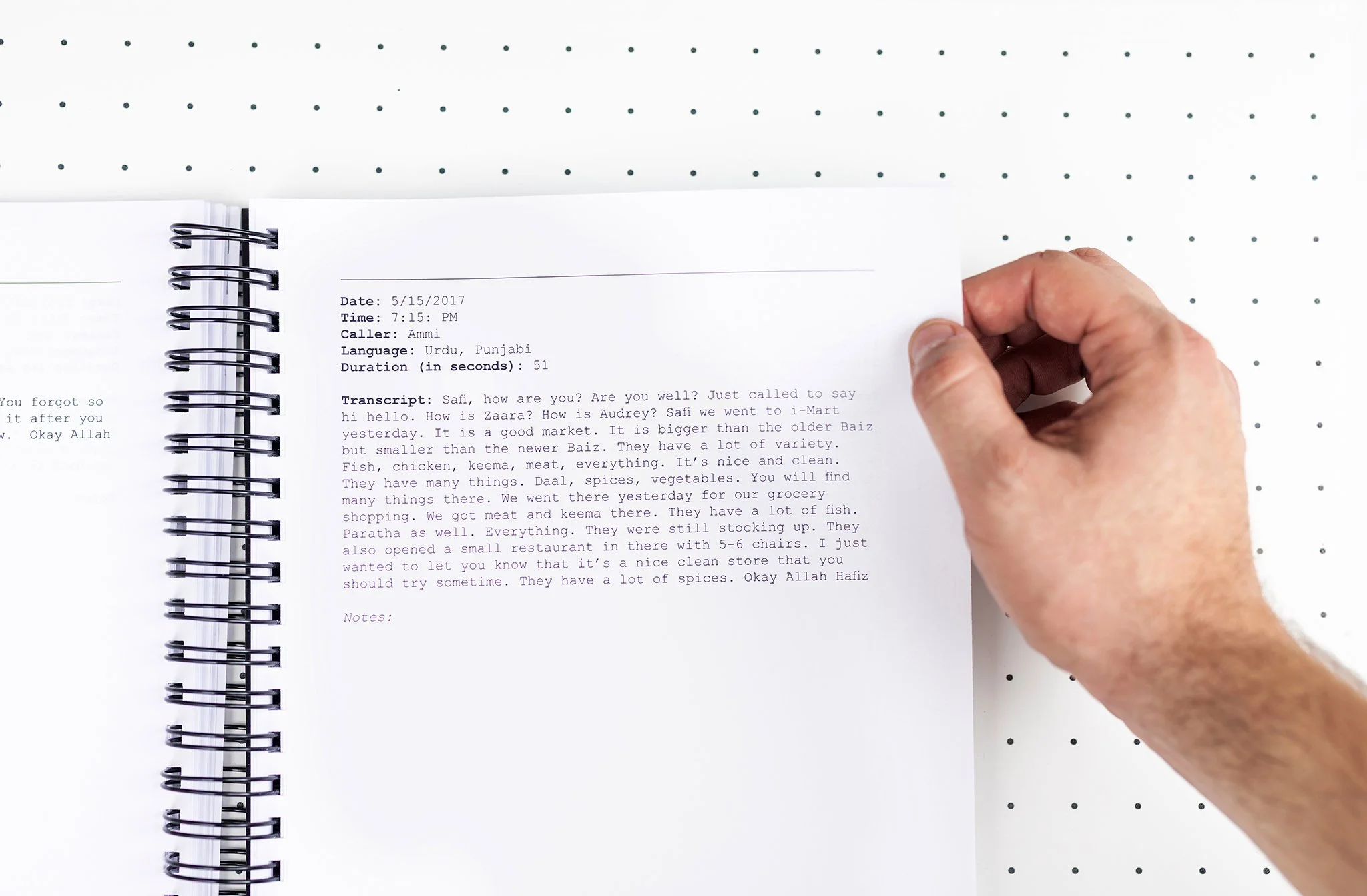 The first part is a 200-page, spiral-bound report formatted like a corporate document. It analyzes every voicemail through charts and data, alongside full transcripts of the messages, which were originally recorded in Punjabi and Urdu. Over time, the report shows a growing distance between us, as her queries shift from my daily life to my partner and then to my children.